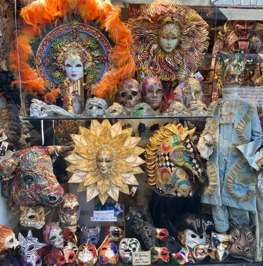 Another of the fun shops were those selling masks and costumes for Carnivale or Fat Tuesday, the day before Lent begins. We learned that the word Carnivale came from the old Italian for “carne” meaning meat and “vale” meaning not eat. Back in the day, people wore full face masks with hinged lower pieces so they could eat with the mask on. It was quite a wild party time with much debauchery without knowing who you were debaching with!