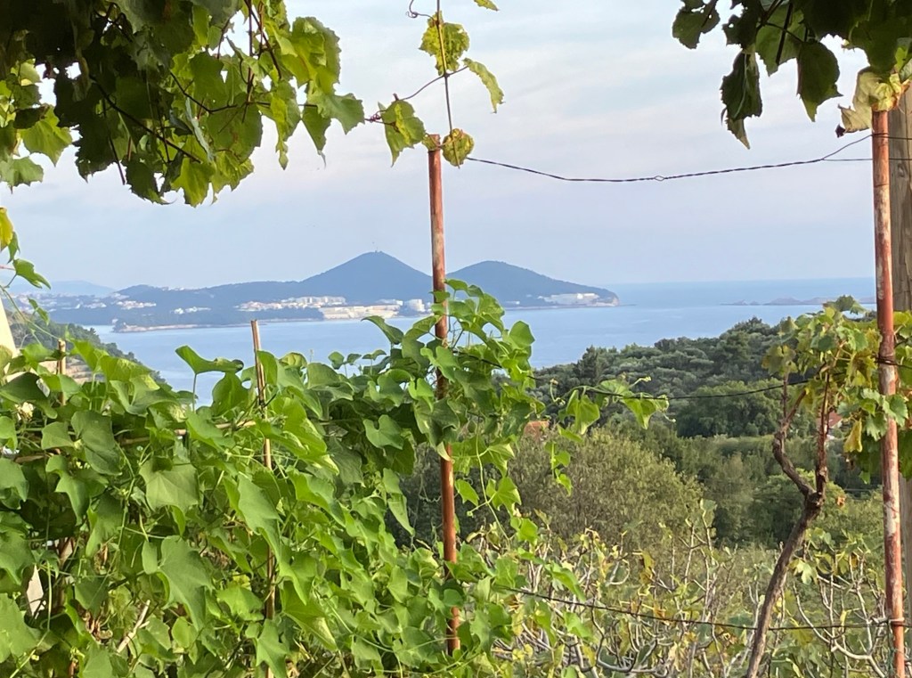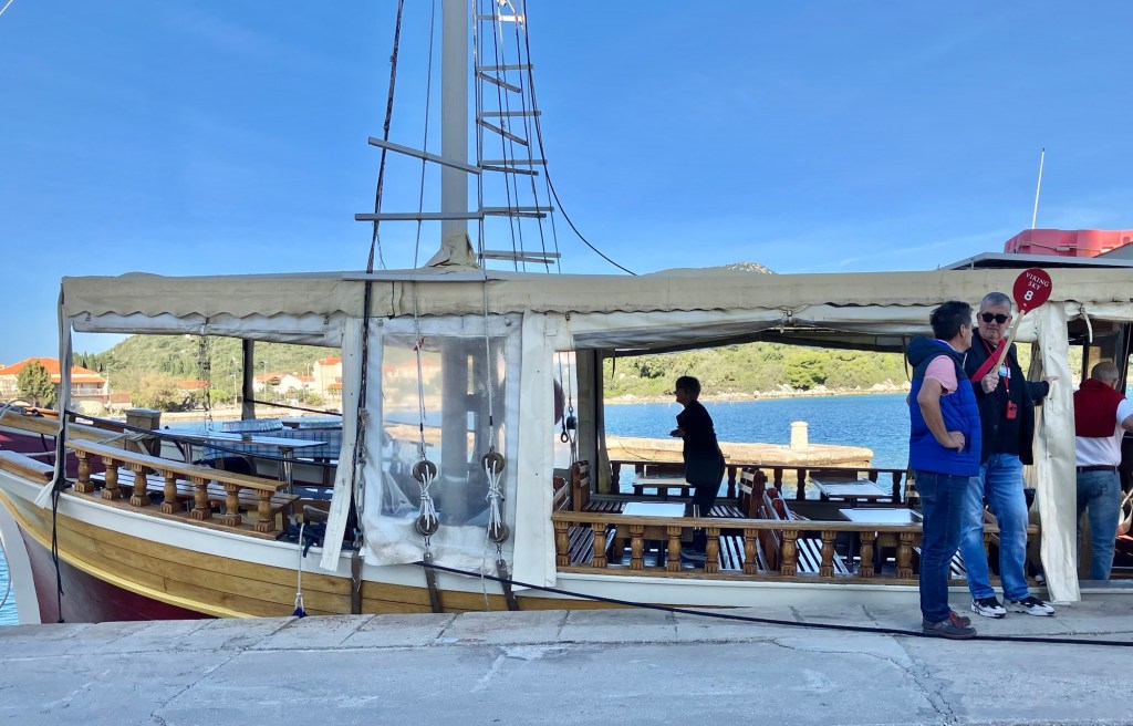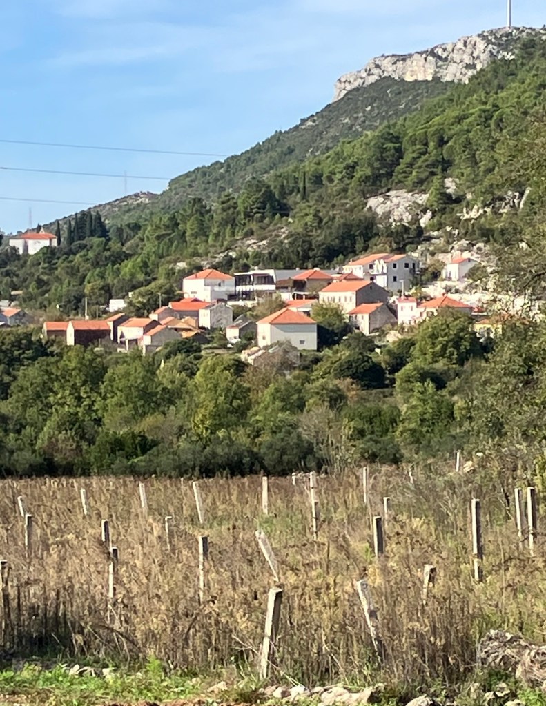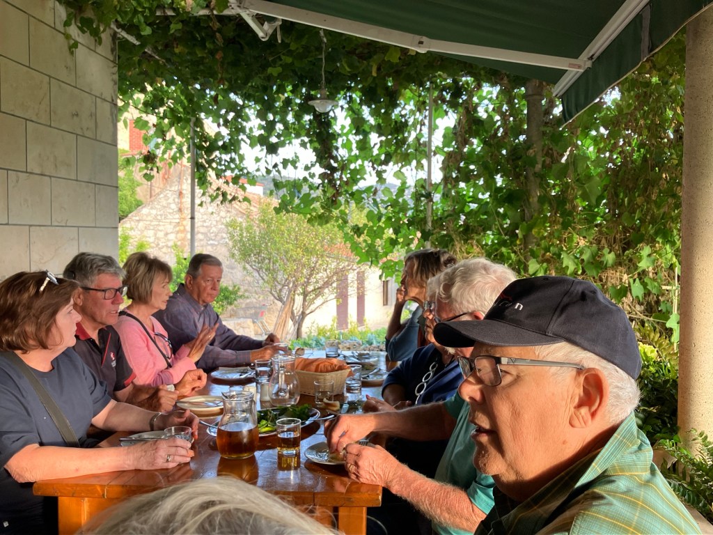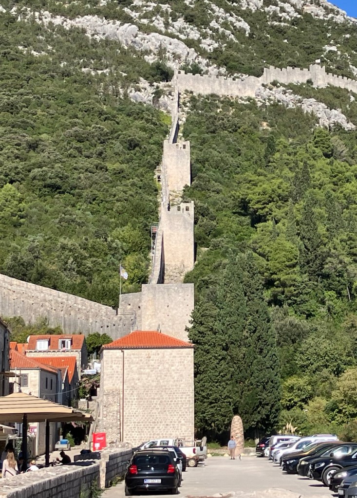 We piled back on the bus and then drove about a mile to the village of Ston, where the locals have harvested salt from salt pans since the Middle Ages. Salt was such a precious commodity that a 4.3-mile-long stone wall was built in the 14th and 15th centuries between Mali Ston and Ston and up the mountain and back down to the other side of Ston village with 40 towers and 5 fortresses all along it. It is called the European Great Wall of China. We didn’t have any wine here, but Ken had to sample the oysters, so we made a quick stop at a cafe for them, while I drank the Prosecco that came with it, and then we raced back to the bus!