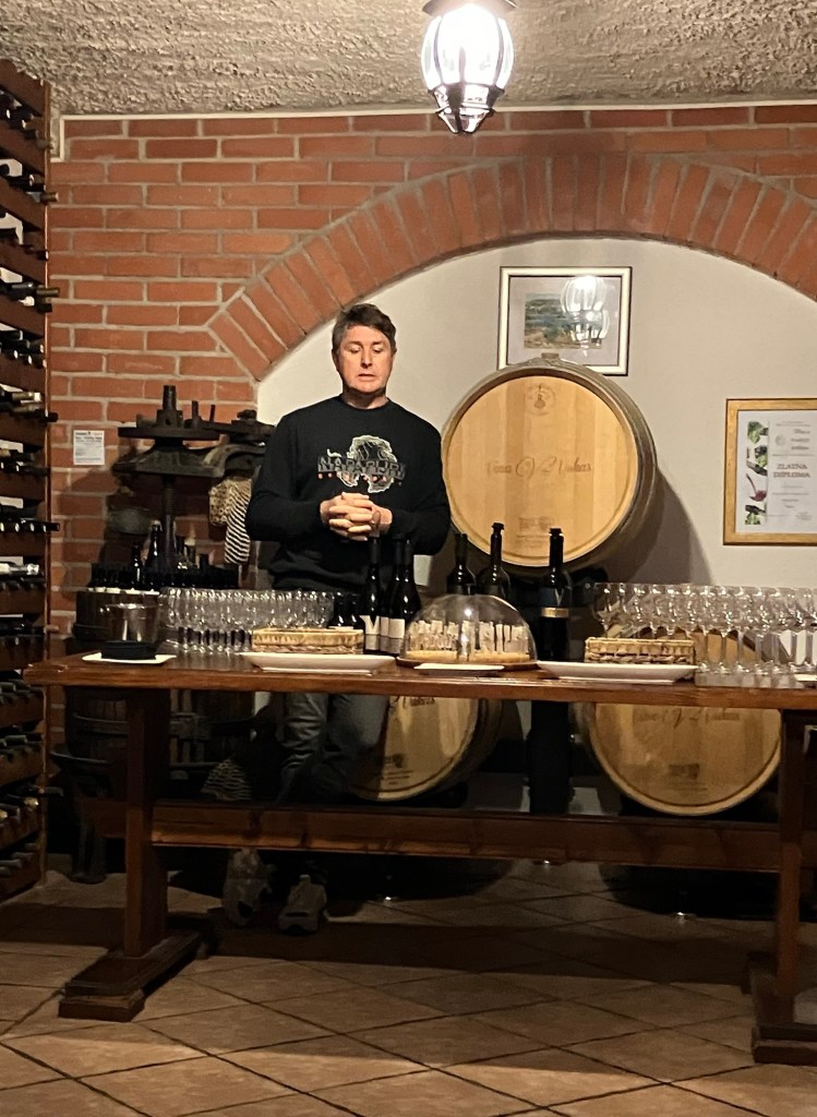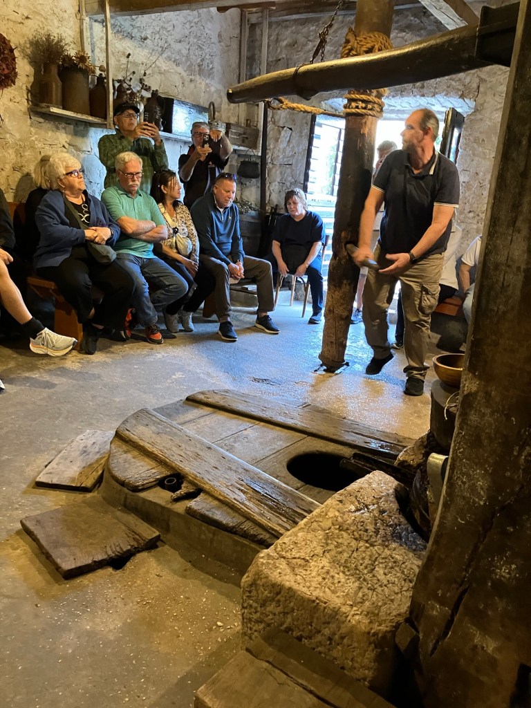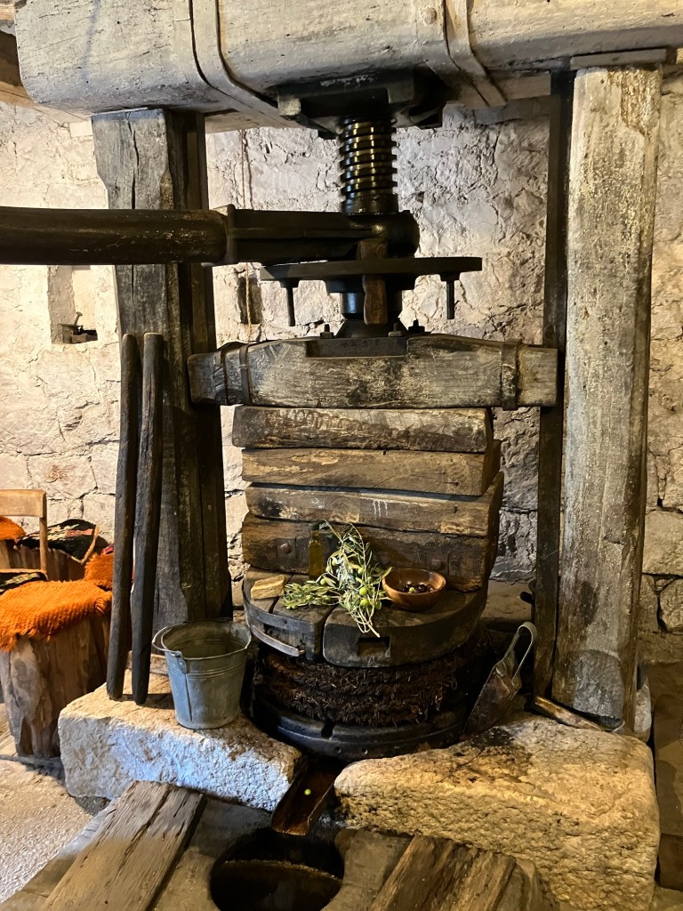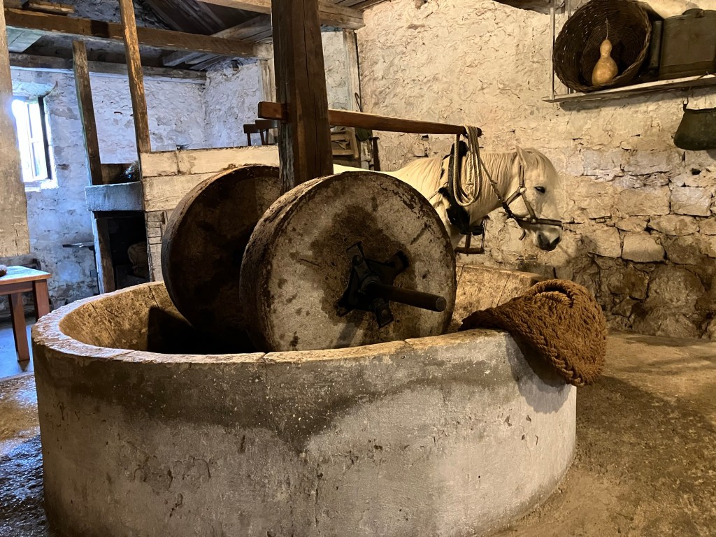 Back on the bus for another short drive through the countryside to another home and small olive oil producer. We were ushered into a small dimly lit ancient stone building smelling of hay and horse manure, with the source of the smell, a white horse named Perla (Pearl) standing quietly, harnessed to two huge round grinding wheels. The owner explained and demonstrated the steps involved in the oil production, beginning with Perla walking around and around mashing the freshly gathered green olives between the huge grinding stones (although she was on medical leave due to an injured leg, so she didn’t walk anywhere except back to her pasture afterwards!). Then the mashed olives are gathered in a woven basket and put in the 300-year-old press, where the two brothers push the long wooden handle back and forth ratcheting the huge screw and plate down to press the oil out. When they can’t move the long handle anymore, they insert smaller sticks as handles into the shaft and walk around in a circle like Perla, pressing out the last of the oil. After they have collected all the oil they can, they let the press sit overnight while the last of it drips into a cistern filled with water. The next day, they scoop out the oil floating on top of the water.
