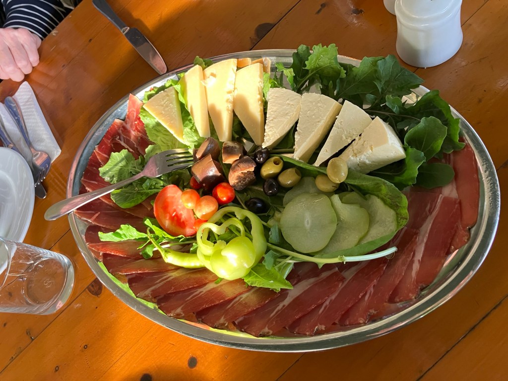Since Viking said we would not be able to eat raw oysters due to increased Health and Safety requirements, we only ate the mussels which were cooked in a delicious herbal broth and served with bread and homemade white wine. Everybody got a bowl of mussels, and Ken dug in. I had two of his, since I’m not a fan!