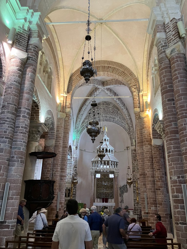 So, back to Kotor. After another pleasant overnight cruise, we woke up as we were finishing the long, winding route through the inlet and into the protected harbor of Kotor. We were berthed right in the city, so it was just a short walk to the old walled portion of town. It is a beautiful little city, and the walls were built around the city, up the mountain, across the ridge and back down to the city at the water. The only entrance when it was built was by water (a street now), so that could be protected easily. The wall and fortresses up the mountain were to keep out any invading Ottomans, and they did the job well with no invaders ever getting to them over the mountain.