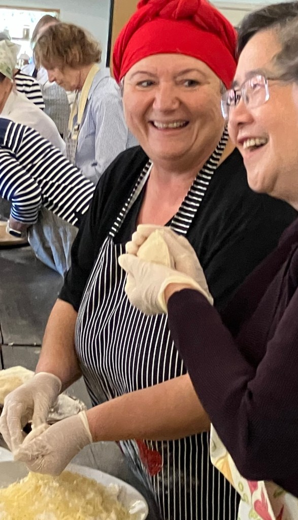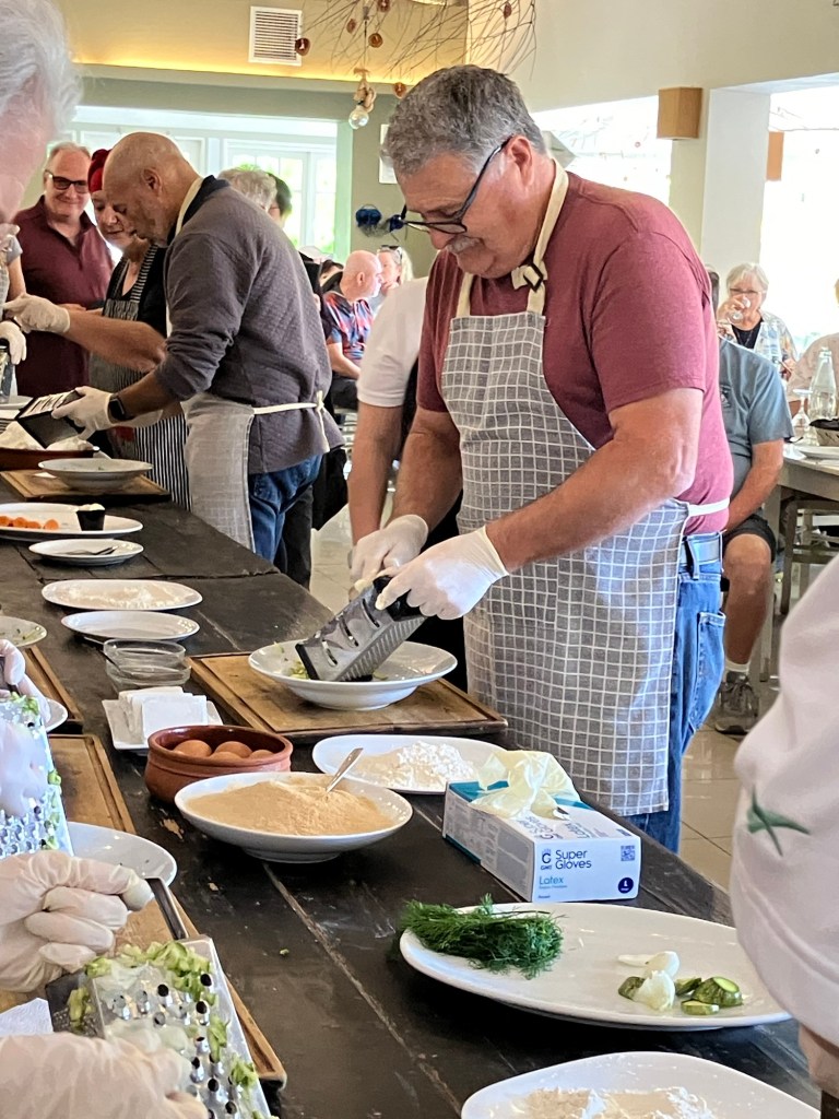Once both busloads of guests were seated, she asked for volunteers to come up and make three Greek appetizers, so I told Ken to go up there (he’s the cook in the family, not me!). All the volunteers lined the tables and donned aprons and sanitary gloves and awaited their orders.