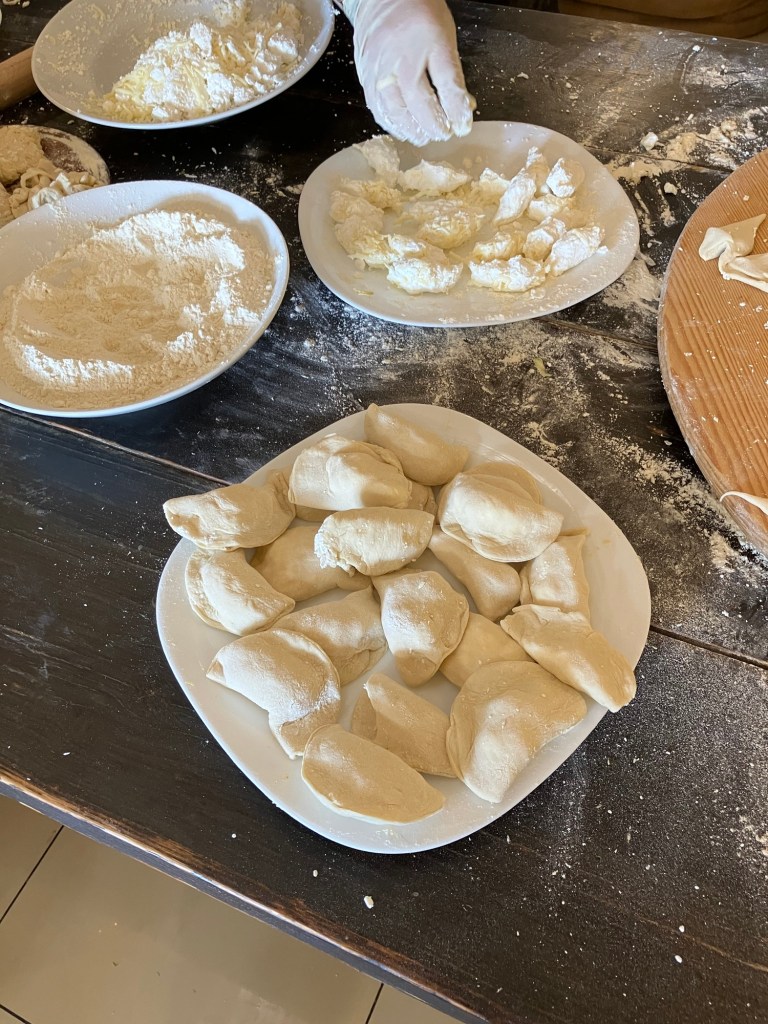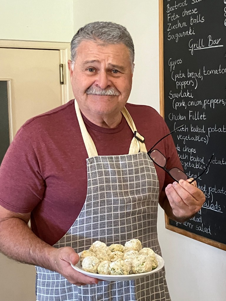 One table made Tzatziki, a yogurt dip for bread, Ken’s table made Kolokithokeftedes, fried zucchini balls, and then after the tables were cleared and the balls were being fried by an employee, some cooks came back up to make Tiropita, small cheese pies (kind of like large cheese ravioli).