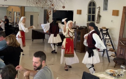 While everyone was eating, the work tables were rolled out of the way, and two men and two women in traditional folk costumes came out to dance traditional Greek dances. While the men did a dance, the women disappeared and returned in black tops and pants with a red waist sash. While they danced, the men changed, and then they all danced more Zorba-like dances and urged the tourists to come out and do the line dances with them, which was a lot of fun!